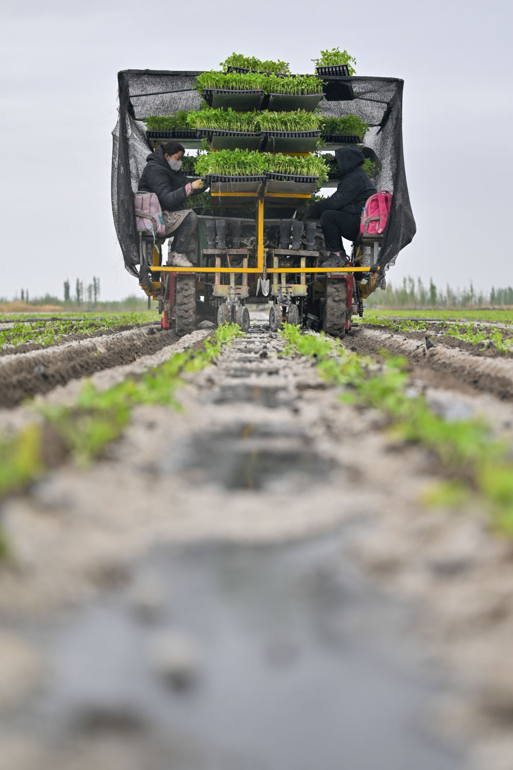 新疆加工番茄种植面积121.5万亩、产量850.6万吨。田间地头“第一车间”和工场“第二车间”的精准跟尾,2024年,2024年,”艾力说。农户正在从动移栽机上投放番茄苗。